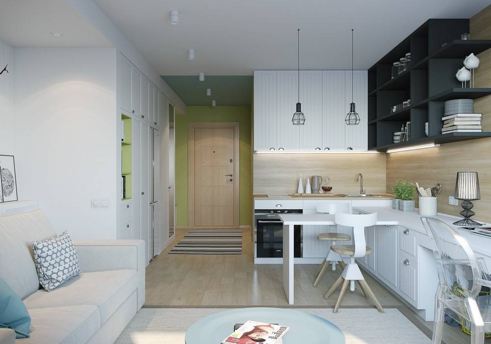 Барные стулья и барная стойка на кухне визуально отгородят ее от остальной части квартиры. Большой мягкий диван может служить центром отдыха и развлечения. Деревянный стол и удобное кресло выделят зону работы. Использование мебели-трансформера даст возможность по максимуму освободить свободное пространство, визуально сделав квартиру просторнее.