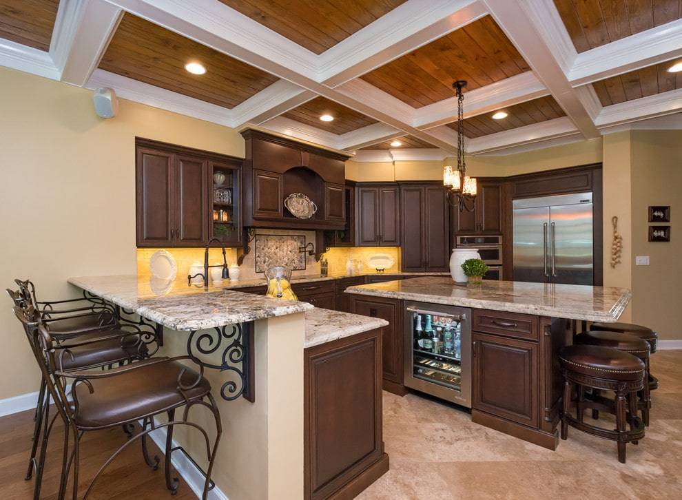 Классическая кухня с нишей в потолке,которая имитирует окно, а ее подсветка заменяет люстру
