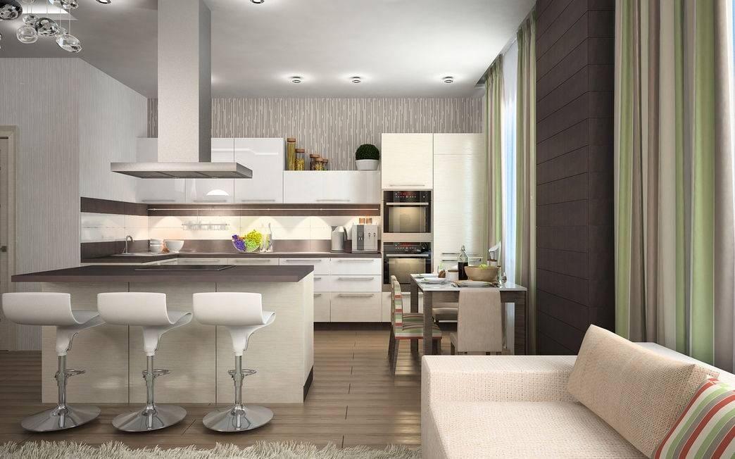 Во многих квартирах кухня – довольно маленькое пространство: это может касаться и «хрущевки», и малометражной квартиры в современном доме. В небольшой кухне часто используют полуостровные кухни, где отдельно вынесена барная стойка – она заменяет стол, красиво смотрится и прекрасно экономит место в помещении.