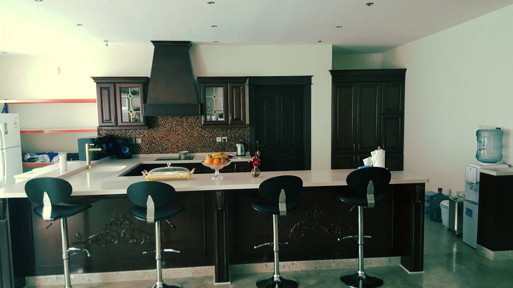 Очень красиво могут смотреться шкафчики и столешница, вынесенные на остров. Иногда отдельно от основного гарнитура располагают мини-бар, раковину, пространство с открытыми полками. Барная стойка также может размещаться как на острове, так и на полуострове. В большой кухне больше возможностей для креатива, и барную стойку можно сделать изогнутой, или даже идущей по кругу.