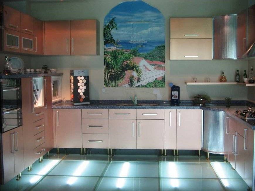 Другой вариант — скрытая светодиодная подсветка стеклянной столешницы. Источник света направляется с торца. Чтобы эффект был максимальным, столешница выполняется из прозрачного кварцевого стекла с нанесенными на поверхность матовыми деталями. Именно они и будут светиться