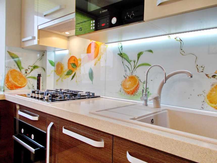 Светящаяся скиналь пришла в кухонный интерьер из рекламного освещения. Это плоская диодная панель с нанесенным на молочное стекло изображением