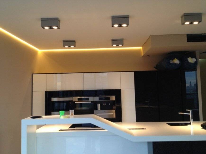 На кухне очень важно предусмотреть равномерный «фоновый» потолочный свет. И лучше, если такие светильники распределены по всей кухне