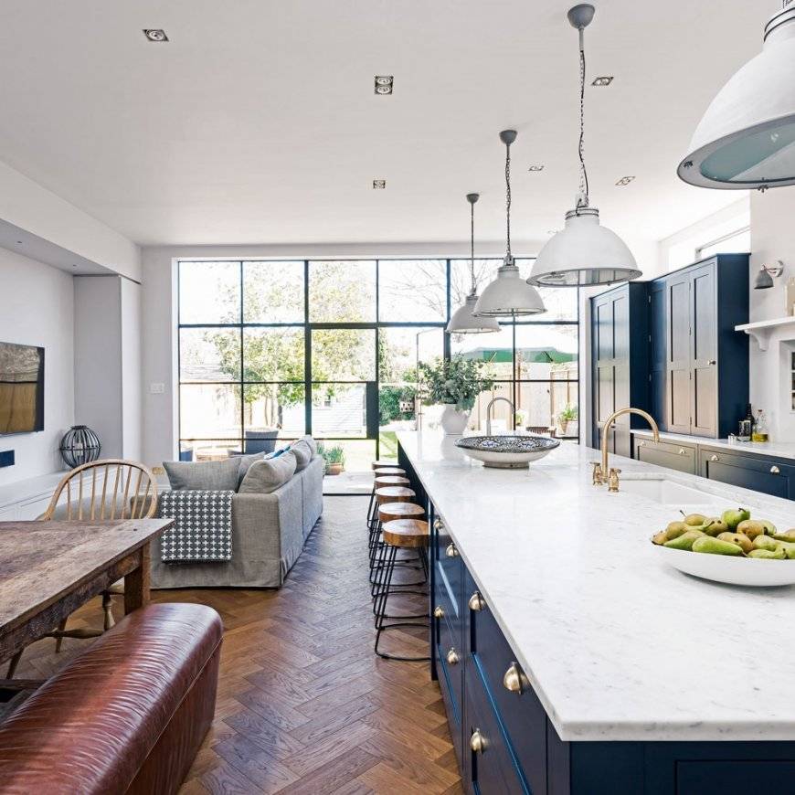 При помощи освещения можно зрительно разделить кухню и гостиную.