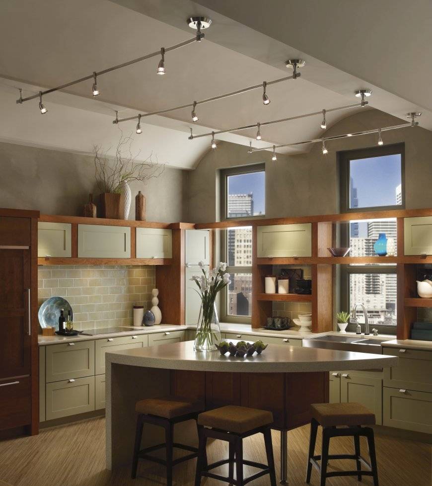 Нормы освещения различных кухонных зон различаются. Так, рабочая зона должна быть качественно освещена, под действием такого света все предметы будут ясно видны, в то время как в обеденной зоне более уместен слегка приглушенный мягкий свет, не слепящий сидящих за столом людей. Но даже когда хозяин ответственно подошел к зонированию с помощью световых источников, общая люстра на потолке не станет лишней. Ее функциональная составляющая остается почти неиспользуемой, ведь она освещает практически пустое пространство, однако ее присутствие сумеет выровнять неравномерность освещенности. Если потолок натяжной или подвесной, то оптимальное решение – монтаж потолочных светильников.