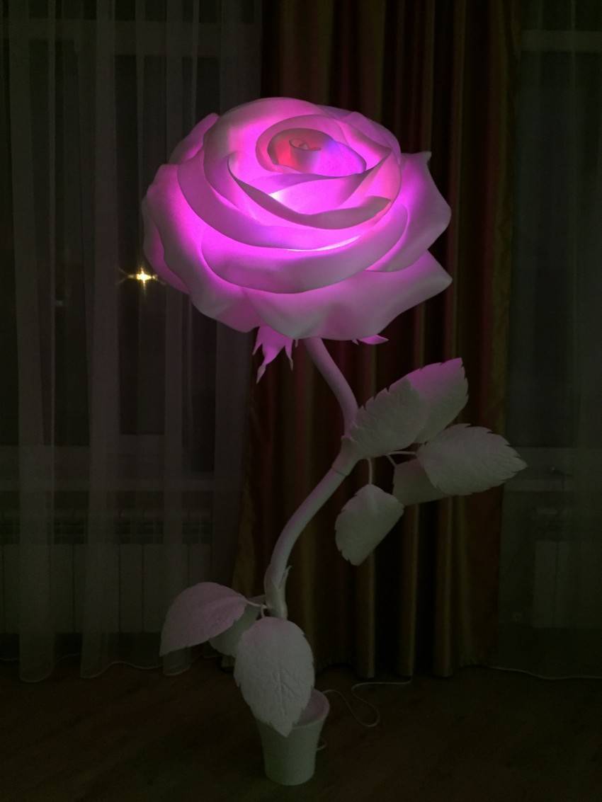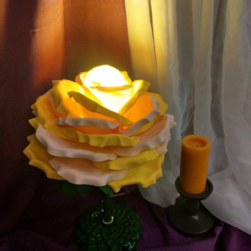 Цветы изготовьте из бумаги так, чтобы внутри они были полые. В качестве источника света укрепите светодиод на батарейке. Он не будет греться, что само по себе уже безопасность. Единственное предостережение: если зажжете и свечи, то поставьте их дальше от цветочной лампы.