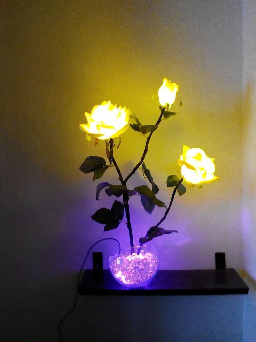 Кроме названных аксессуаров понадобятся плотная бумага, фильтры для кофе, акварельные краски, клей и желание творить красоту. И ваш цветок-светильник, сделанный своими руками, изысканно засияет.