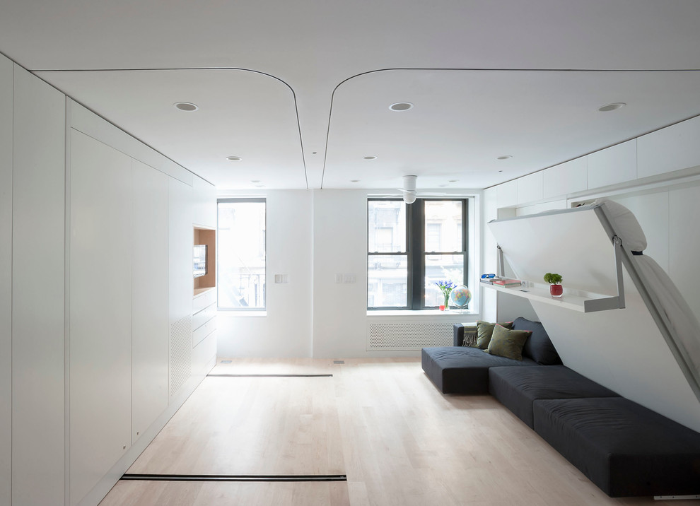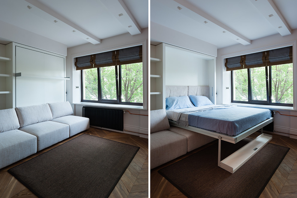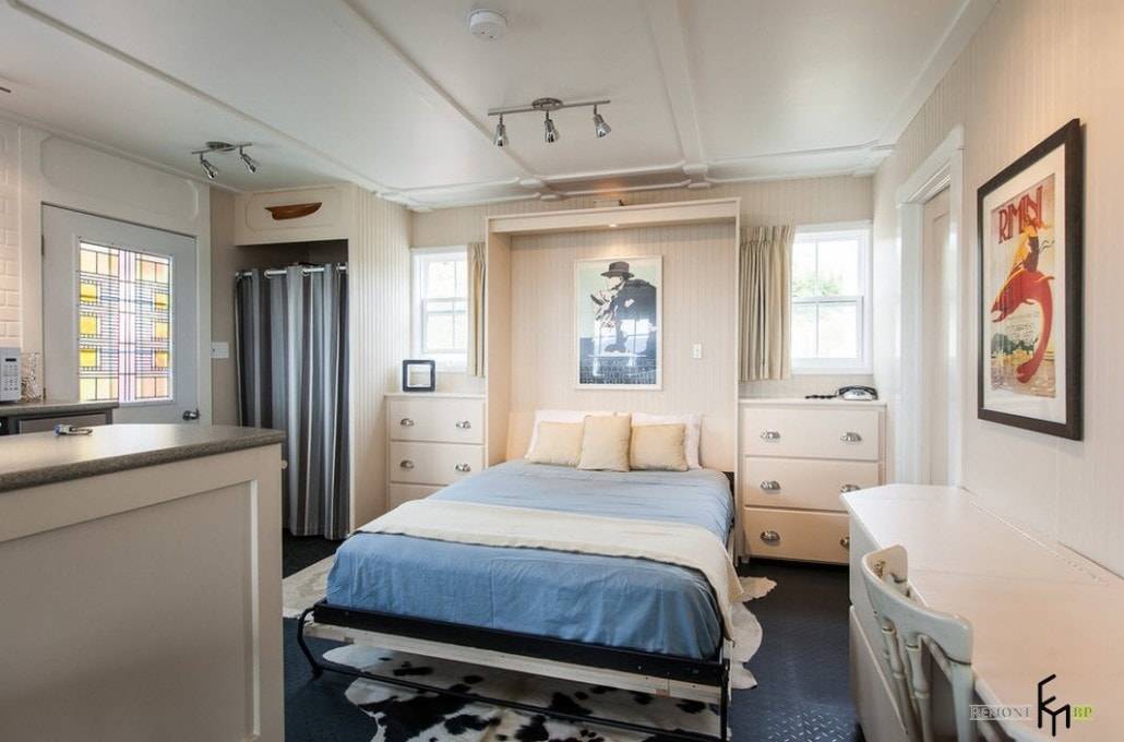 - Расширение функционального предназначения комнат. Встроенная откидная кровать размещается в зале, а на день складывается в шкаф;