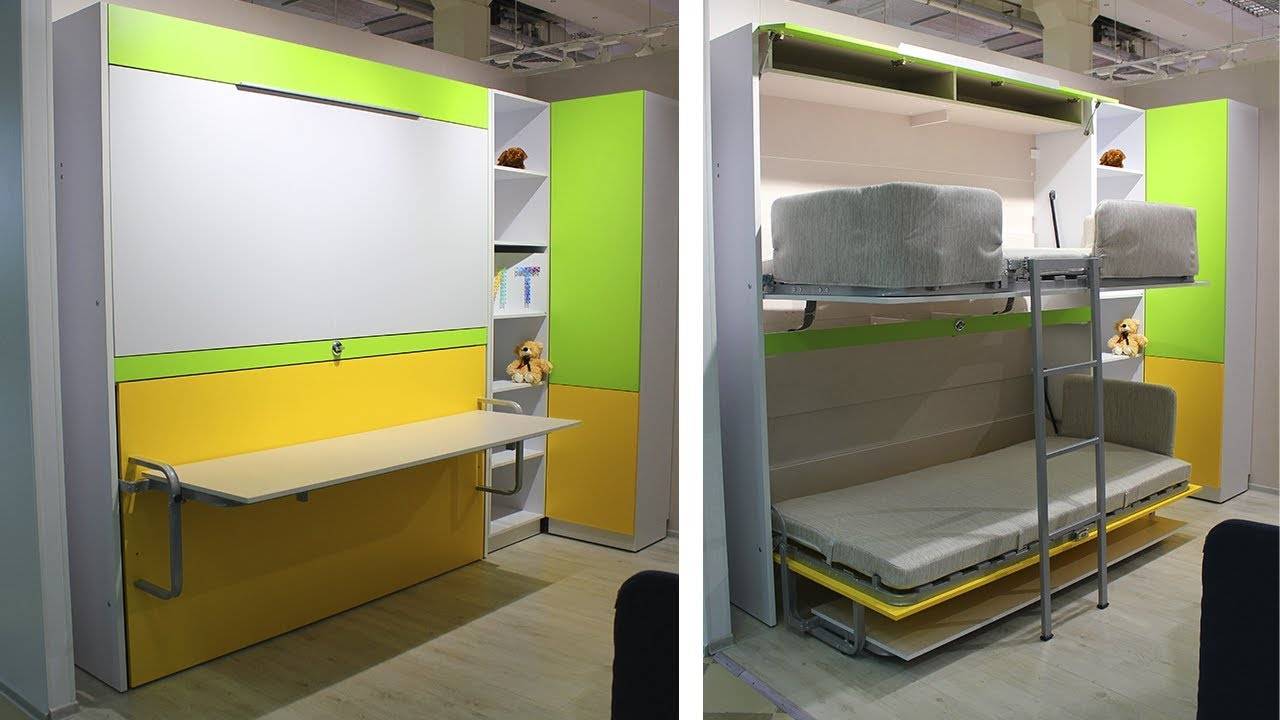 - Кровать-трансформер. Представляет собой обычную односпальную, полутораспальную, двуспальную, двухъярусную или детскую кровать, которая в собранном виде может являться частью гарнитура или обособленного шкафа.