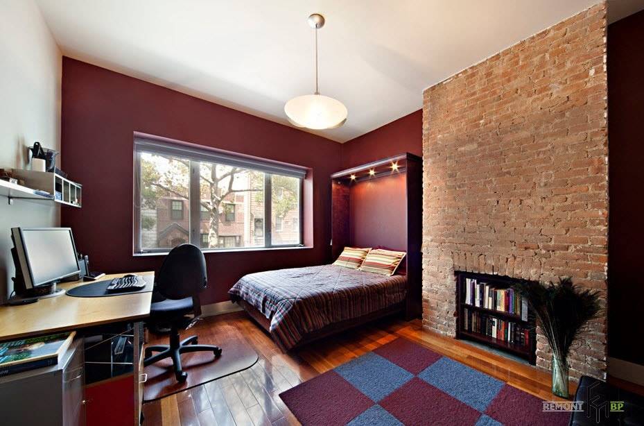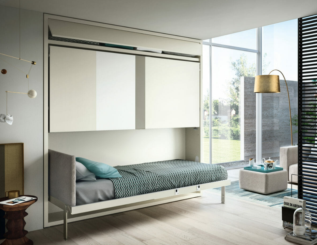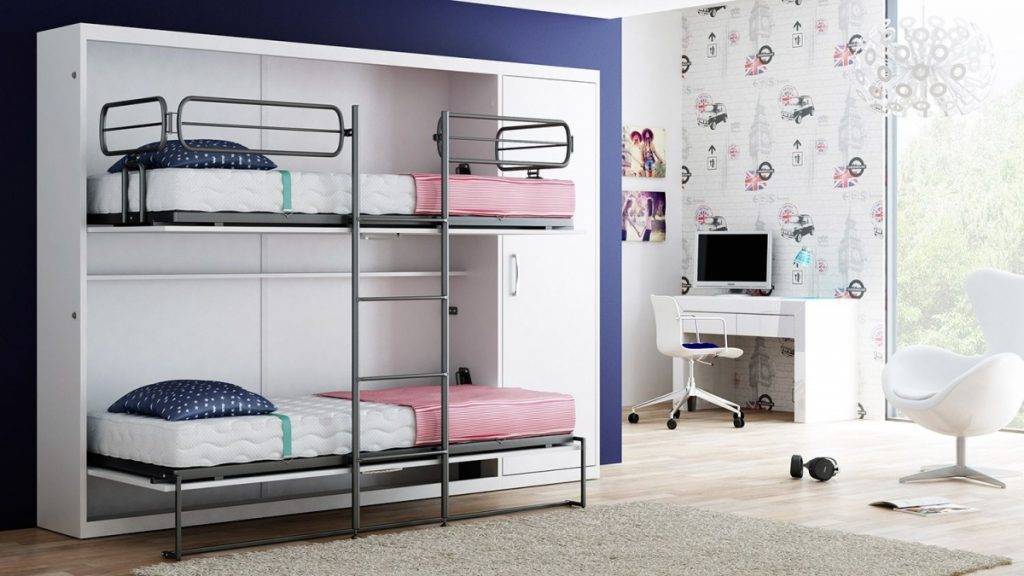 В сложенном состоянии становится частью шкафа или стены, а при необходимости легко откидывается, превращаясь в кровать. Подъемные элементы позволяют поднимать и опускать конструкцию, а короб становится местом для хранения вещей. Рационально используется стенка с откидной кроватью-шкафом, где на полках и стеллажах компактно разместится домашняя библиотека.