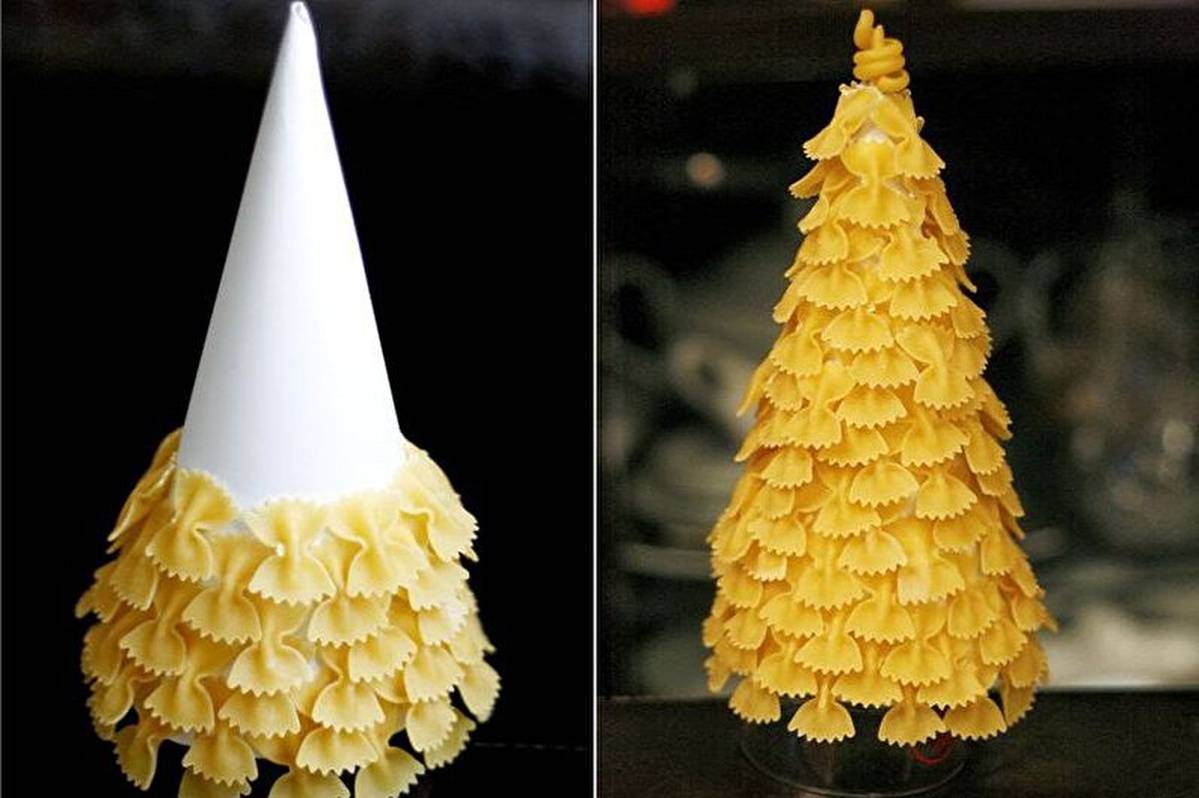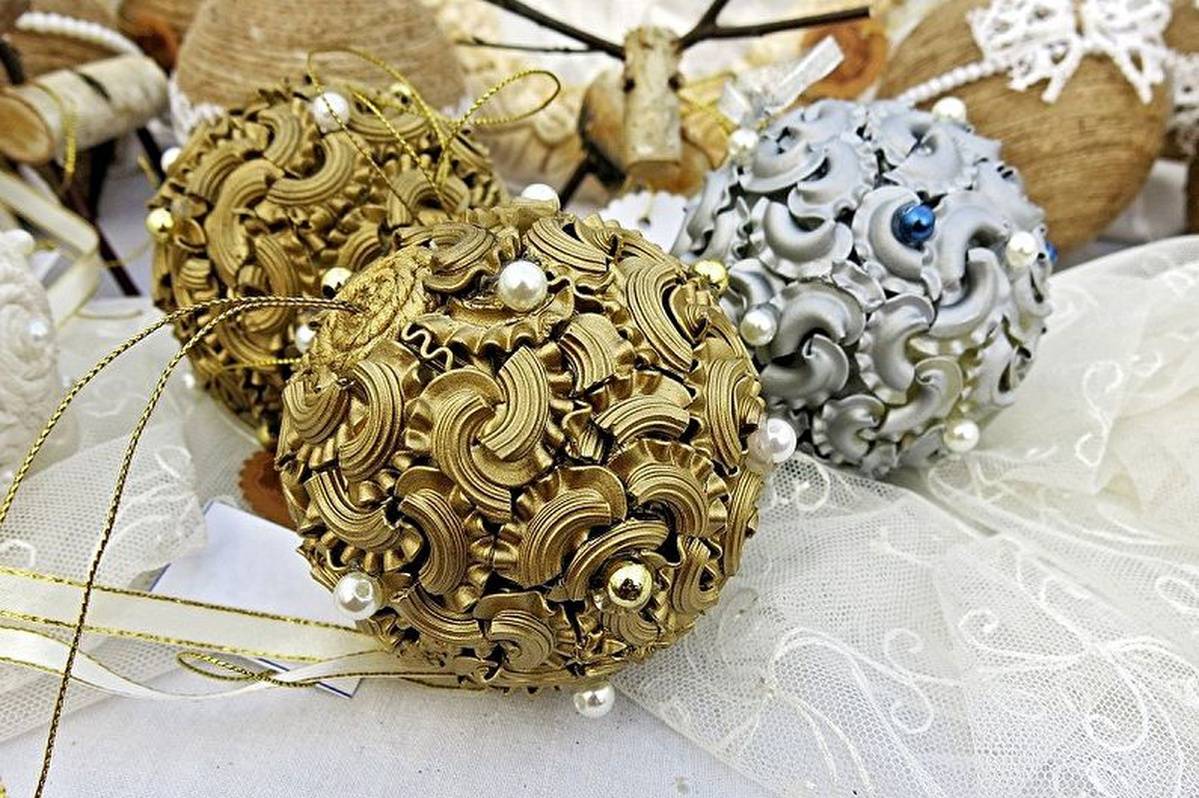 С помощью спагетти и макарон различных форм можно сделать самые разнообразные новогодние украшения. Чаще всего для их окраски используют аэрозольные краски, такие как бронза, позолота, серебро, которые придадут изделию необычайно красивый и торжественный вид. Можно также воспользоваться белоснежной краской, напоминающей о снежной зиме.