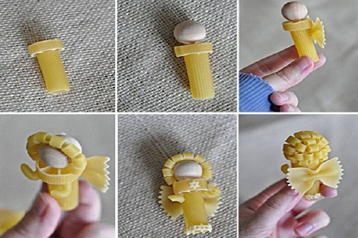 - макароны: большие трубочки для туловища, бантики для крыльев ангела, цветочки или колеса для воротника, короткие трубчатые макароны для имитации волос, мучные звездочки для украшения, рожки для ручек;