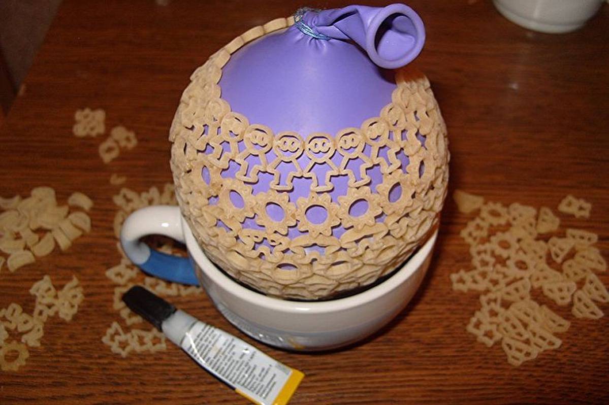 Для изготовления чайника вам необходим воздушный шарик. Надуйте его до желаемого размера, а затем оклейте макаронами (предпочтительно той же формы, что и у подноса), стараясь располагать их близко друг к другу. Сверху оставьте небольшой круг не оклеенным.