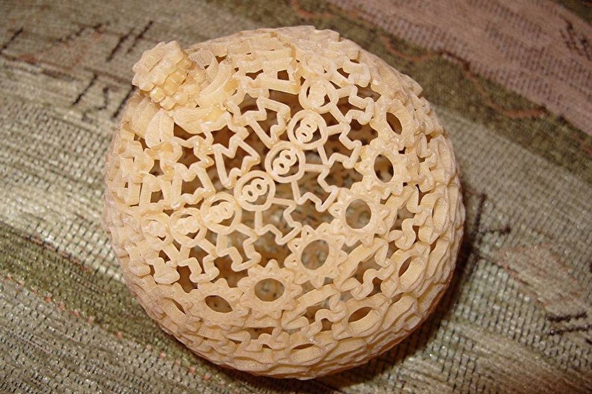 Если вы выбрали способ изготовления с помощью шарика, его нужно надуть и зафиксировать нитью. Затем начинаем аккуратно приклеивать макароны. Здесь нужно учесть важный момент – детали нельзя клеить непосредственно к резиновой поверхности, все элементы аккуратно склеиваются между собой. Лучше отдать предпочтение мелким макаронам, которыми удобней оклеивать круглую поверхность