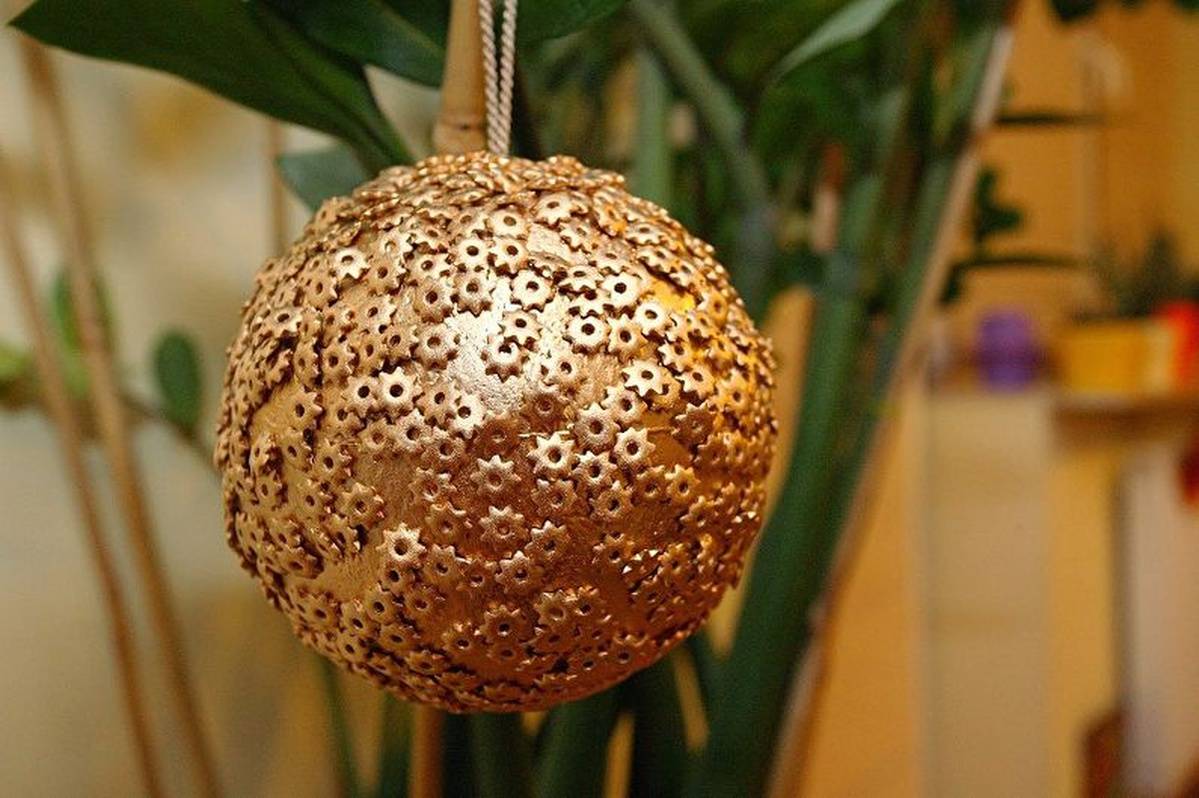Новогодние шары – самое популярное елочное украшение. Чтобы сделать его своими руками из макарон, понадобится обычный надувной шарик или круглая заготовка, которую можно купить в магазине для рукоделия. Если вы выбрали второй вариант – дело пойдет намного быстрее. Поверхность заготовки попросту оклеивается макаронами, а затем окрашивается (не забудьте предварительно сделать петельку, за которую игрушка будет вешаться на ветку).