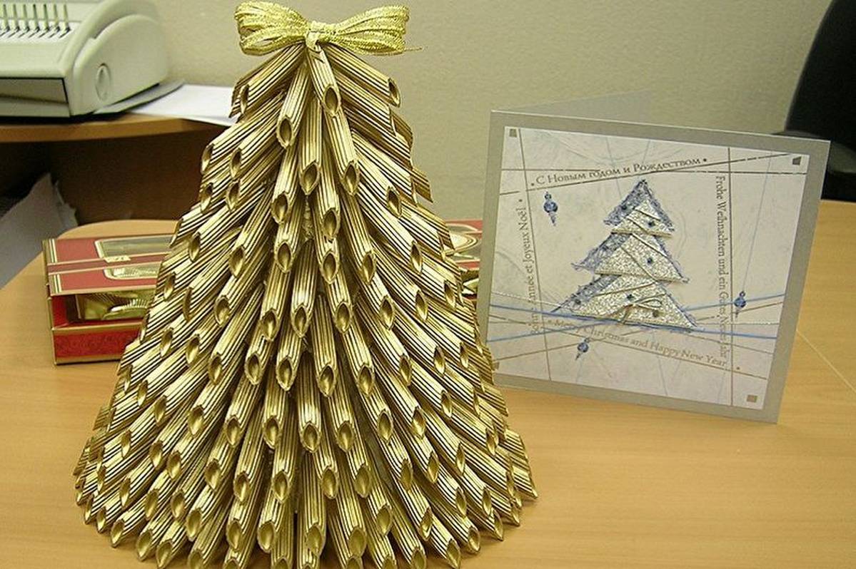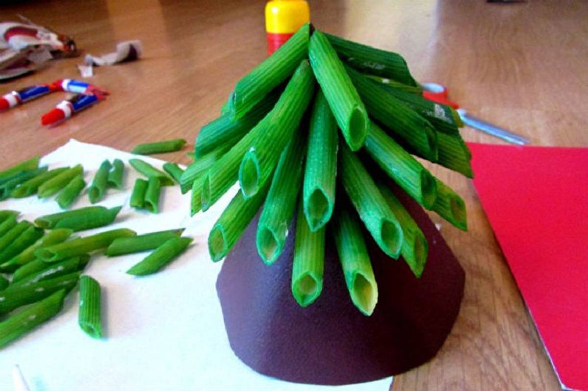Чтобы сделать небольшую, но очень красивую елочку, понадобится плотная бумага или картон, из которого формируется конусная основа. Далее выбираем материал. Как показано на фото, елочку можно сделать из разных форм макаронных изделий.