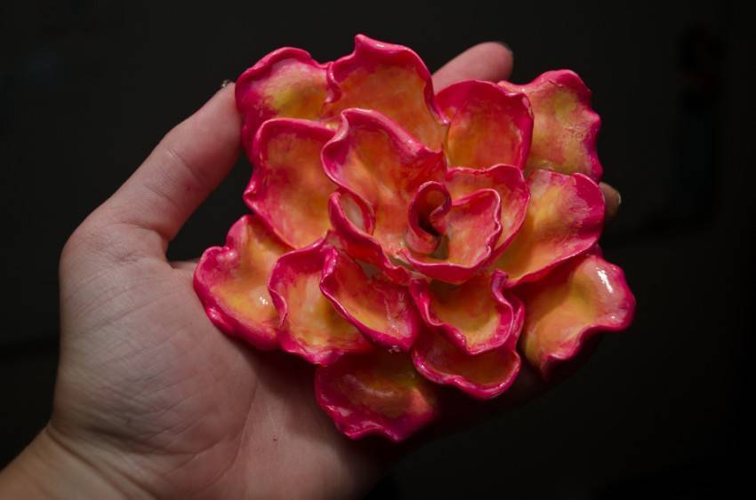 - Когда бутон розы будет готов, нам понадобится его разукрасить красным цветом с помощью аэрозольной краски. Данную работу также проделываем тщательно.
