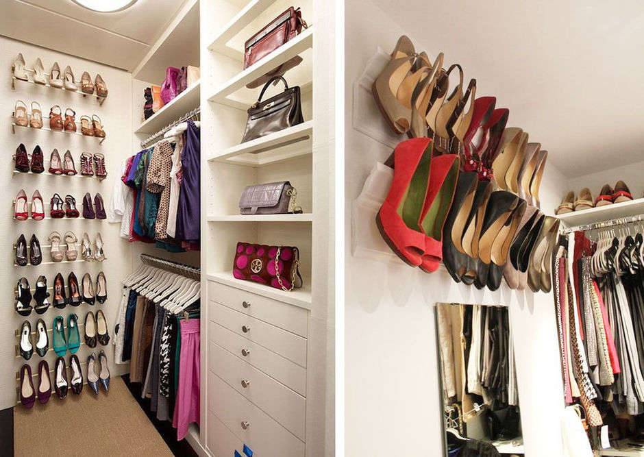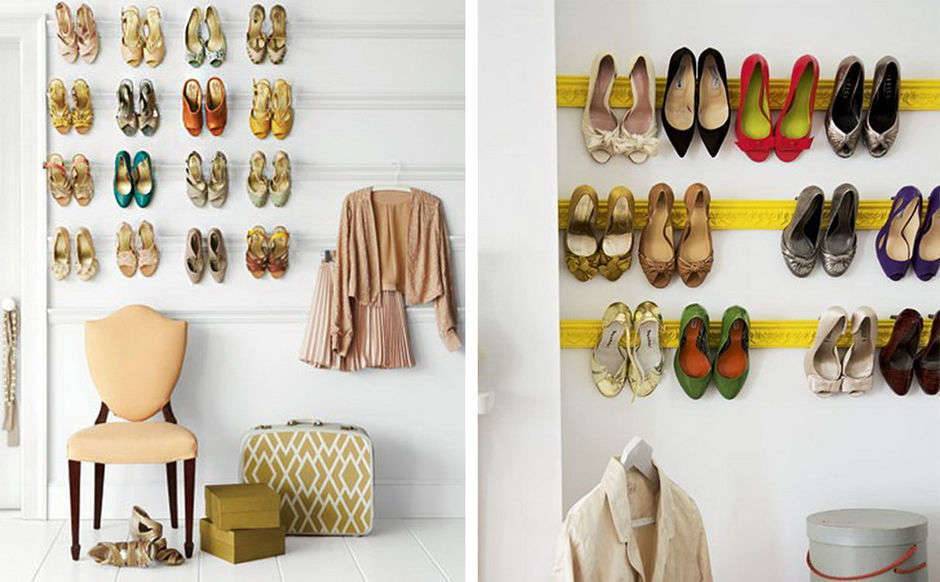 Женские обувные сокровища можно хранить, повесив за каблук на рейлинг. Такой способ существенно экономит место, и под него можно приспособить одну из дверей.