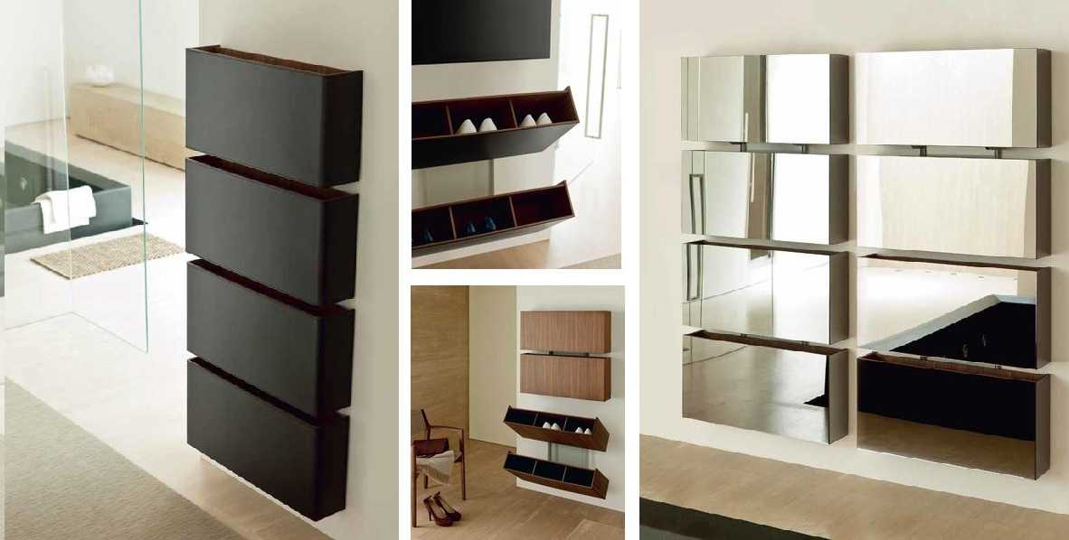 Помимо классических вариантов и оригинальных, выполненных самостоятельно, обувницы представлены более сложными системами. В них могут быть удобные откидные или выдвижные полки. Обувь размещается как вертикально, так и горизонтально, максимально используя свободное пространство.