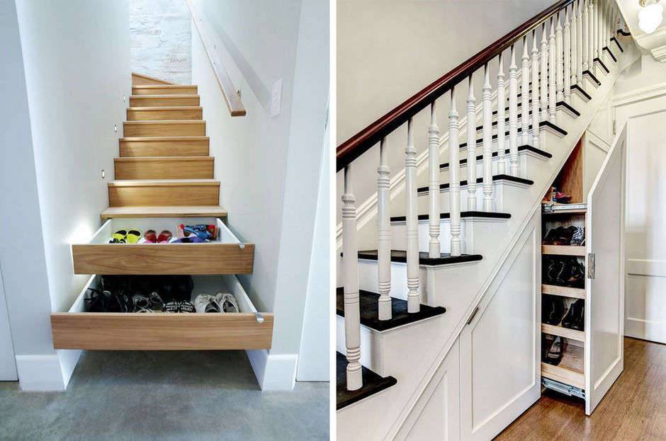 В современных домах туфли и ботинки актуально прятать в необычных местах. Одно из таких мест – ступени лестницы. Дабы не терять свободное место, выполняются выдвижные или открывающиеся полки, где будет храниться не только обувь, но и одежда.