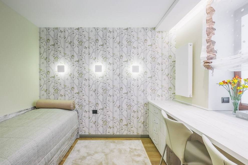 На фото детская комната с акцентной стеной, оформленной обоями с абстрактным рисунком.
