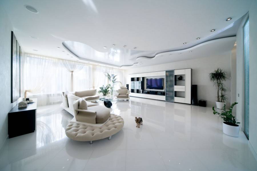 Двухуровневые и многоуровневые. Концептуальное решение, которое воплощает изысканную элегантность фактурной или глянцевой пленки, в сочетании со сложной геометрией и выстраиванием нескольких уровней из гипсокартона.