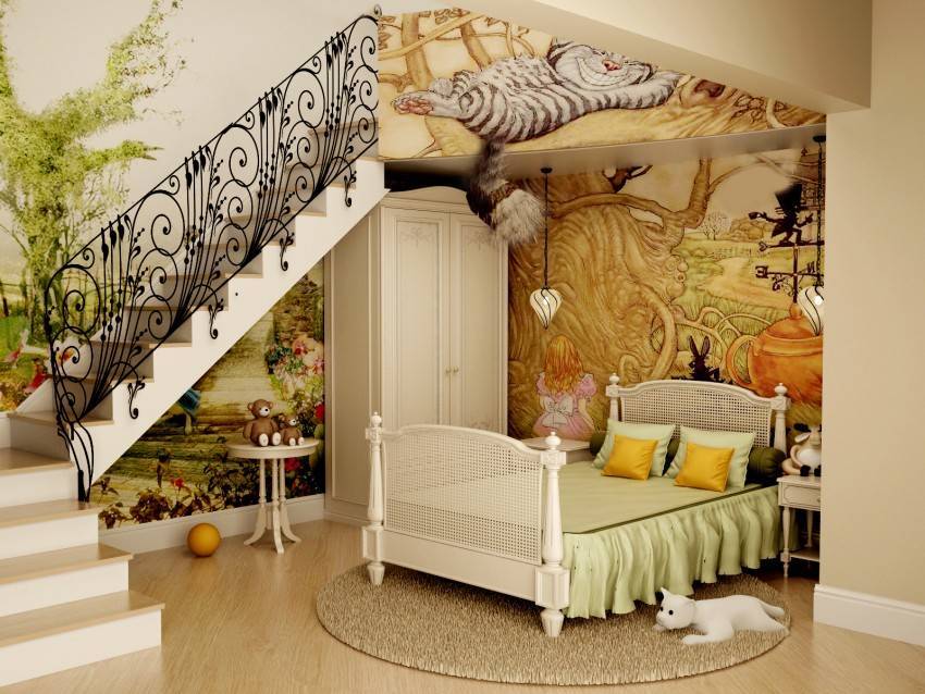 Для детских комнат интересным станет тематика любимых мультфильмов, герои, для спальной комнаты — облака, цветы, деревья, прочие естественные «напевы».