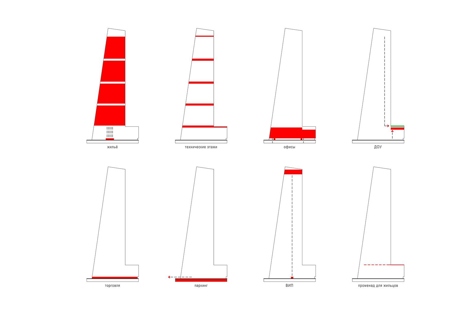 Небоскреб будет включать парковку, офисы, физкультурно-оздоровительный центр, торговый комплекс на первых этажах. Жилье разместится с 20 по 105 этажи. На 19 этаже будет открытая терраса, зона досуга и отдыха жителей, зимний сад.