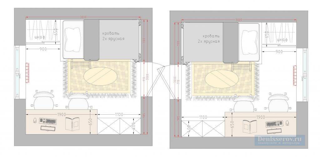 Другой вариант — обустроить письменные столы на специальном подиуме. В образовавшейся нише можно спрятать выдвижные кровати.