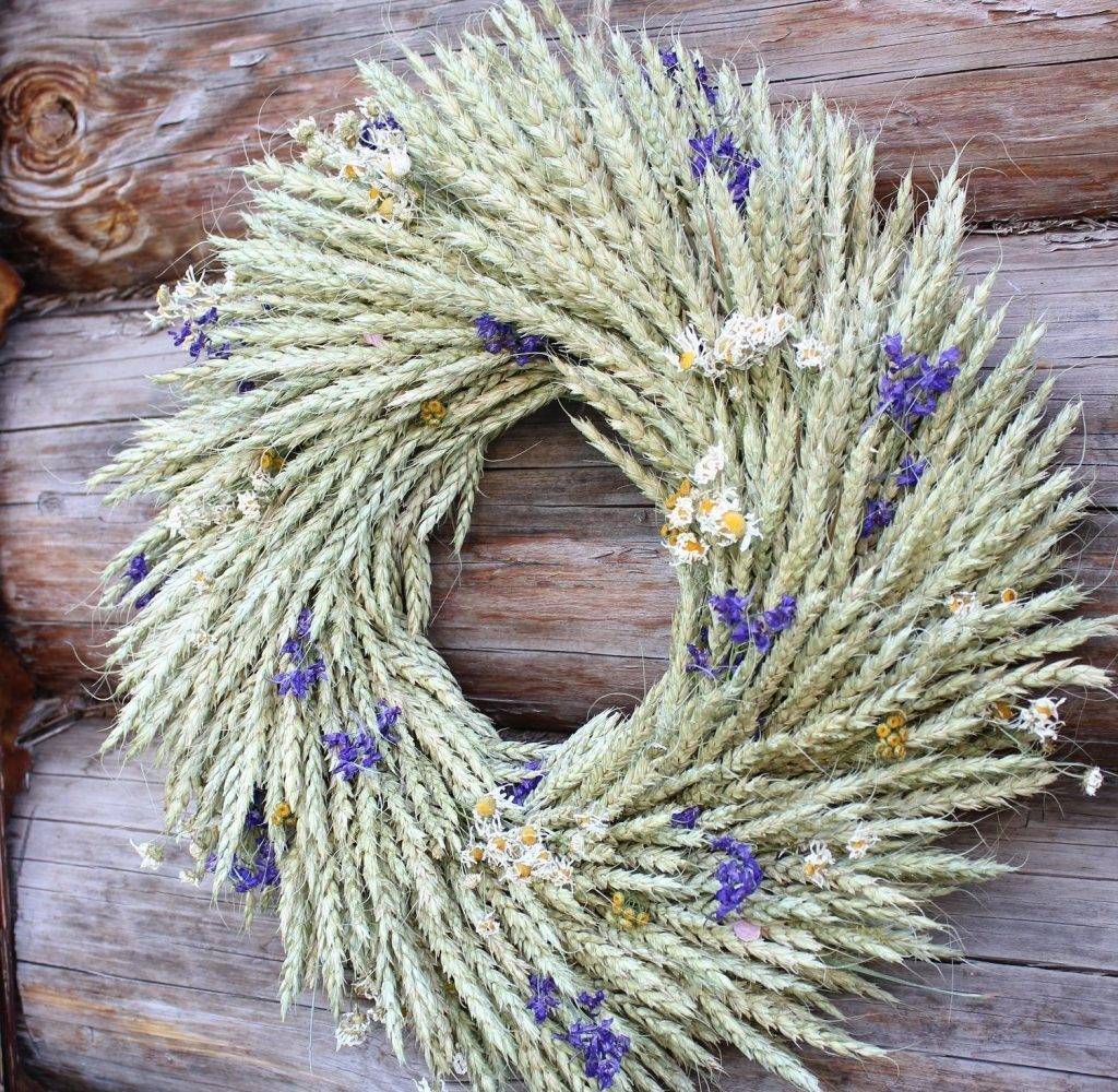 Колоски пшеницы — символ урожая и плодородия. Соберите небольшой букет листьев и сплетите из них венок. Закончить оригинальный венок можно с помощью мелких желтых листьев канадского клена или табличкой “Добро пожаловать!”.