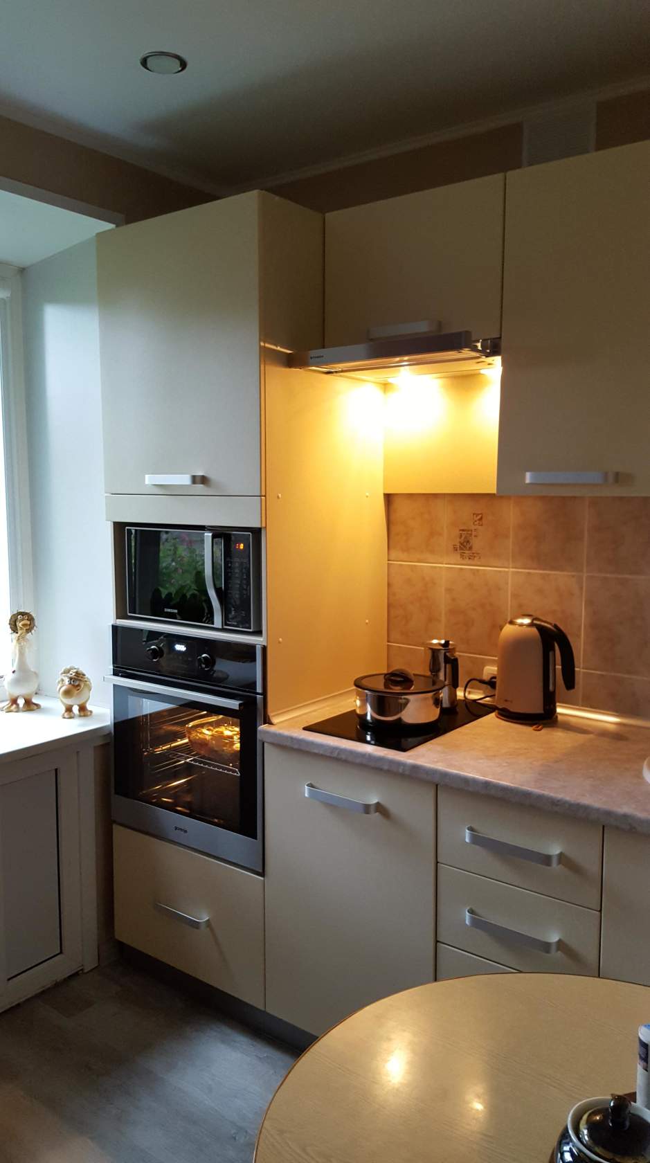 Чтобы вся необходимая техника поместилась в тесной кухне, нужно рассмотреть многоуровневое ее размещение. Например, микроволновка и духовка могут находиться не на столе, а выше, на полке на уровне глаз.