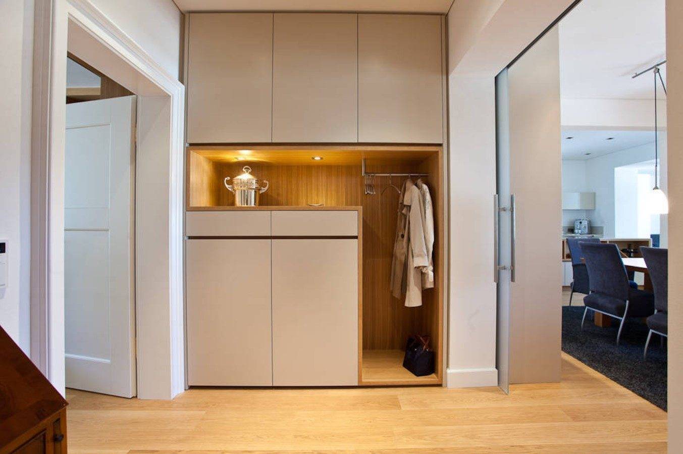 Шкаф. Наиболее практичным вариантом является полноценный шкаф. При его отсутствии интерьер прихожей будет выглядеть неполноценно.
