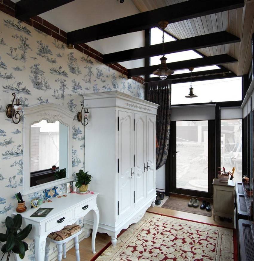 Если предпочтение отдано стилю кантри, в интерьере можно размещать всевозможные элементы, изготовленные в деревенском стиле. Среди цветовой палитры преобладают бежевые, розовые, коричневые, оливковые оттенки. Стены можно оклеить обоями в мелкий орнамент либо облицевать деревянными панелями.