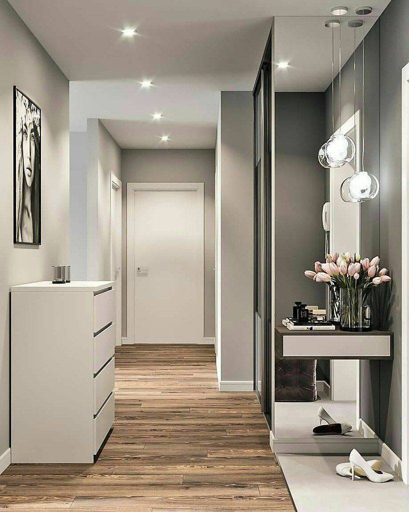 Обустройство узкой маленькой прихожей предполагает не только совпадение цветов стен, но и пола. Вы можете выбирать из различных материалов, из которых можно сделать определенную отделку. Задумываясь о том, как оформить маленькую прихожей, стоит выбрать деревянные полы. Это решение, создающее уютную атмосферу.