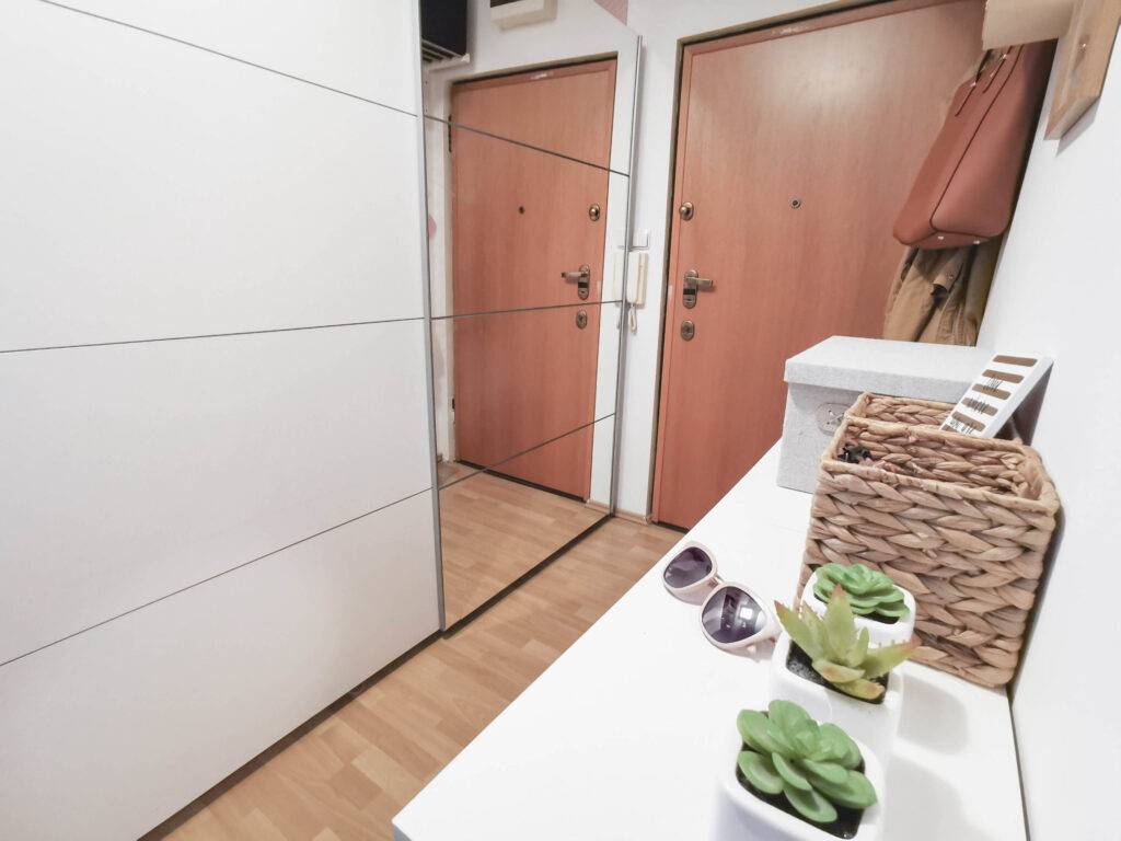 Для небольшой квадратной прихожей подойдет вариант размещения мебели по обеим сторонам. По одной стене ставят открытую вешалку с полочкой для обуви и комодом с зеркалом, по другой — небольшой шкаф-купе. Или угловые шкафы с открытыми или закрытыми фасадами, а в остальном пространстве размещают тумбы для обуви и пуфик.