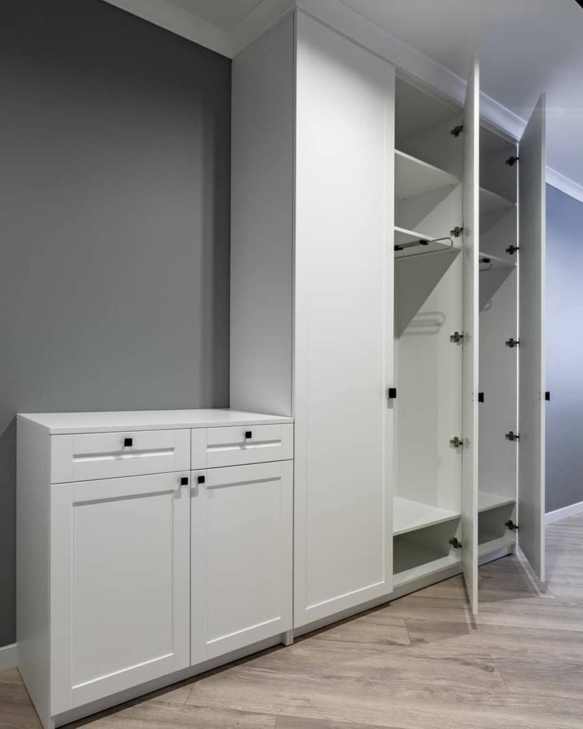 Если пространство очень мало, не пытайтесь запихивать в стену огромный шкаф. Лучше подобрать шкаф до 1 метра шириной с полочками и крючками, а также местом для головных уборов