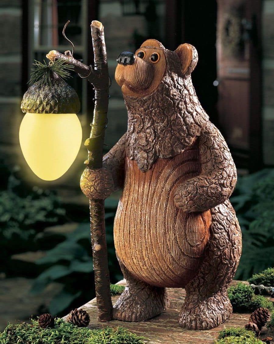Дерево. Скульптуры, изготавливаемые из дерева, требуют определенных навыков. Получаются они очень выразительными. Благодаря природной текстуре, деревянные фигурки способны украсить лужайку, тенистый уголок, клумбу, игровую зону.