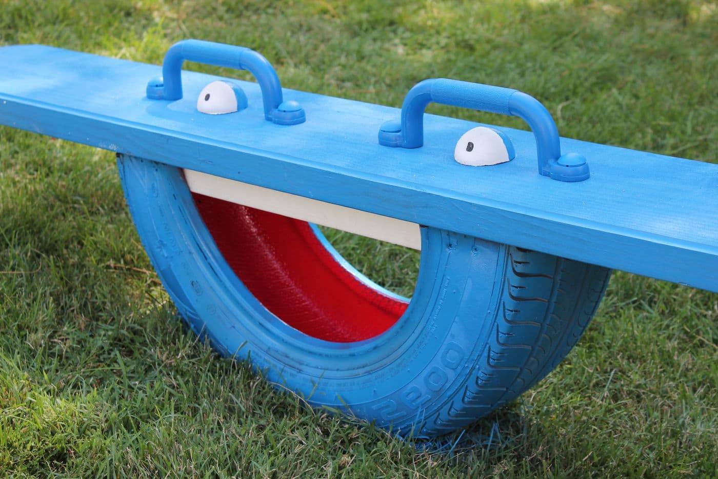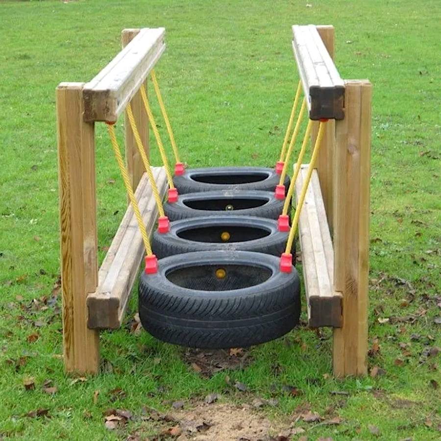 Удобной будет качели из автомобильных покрышек. Таких изделий можно выполнить несколько. Нужно просто вырезать два кольца по бокам, сформировать спинку и вывернуть шину наизнанку. Армированные кольца полностью не срезаются, они послужат ручками для крепления к дереву или перекладине. Разукрасьте приспособление краской — порадуйте ребенка.