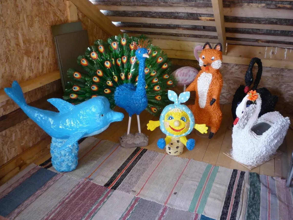 - домашний зоопарк, размещённый в глубинах сада, лошадки из берёзовых брёвен, свинки из пятилитровых бутылей и пр.