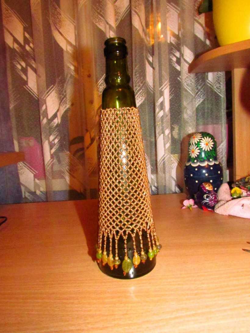 По мере заполнения всей наружной площади (кроме низа) нить обрезают, аккуратно запрятав ее конец. Такой дизайн прост и в то же время эффектен. В подобную вазу можно поставить живые цветы, ее можно украсить узлами из рабочего материала.