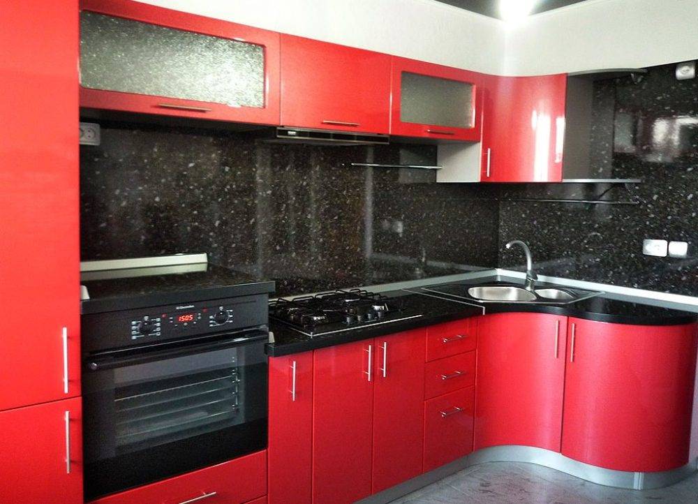 Гарнитур может быть изготовлен не только в красно-белом дуэте. Это сочетание может быть дополнено черной столешницей, как на фото ниже. В черной отделке могут быть выполнены также и дверцы бытовой техники.