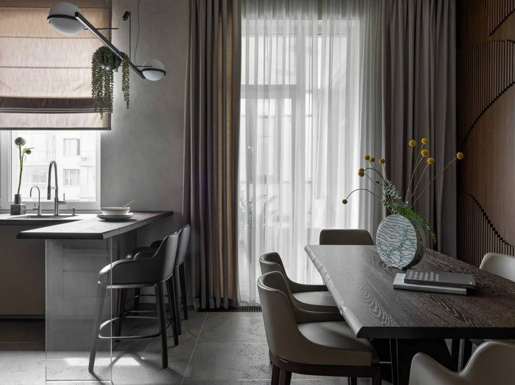 Чтобы интерьер не выглядел скучным, акцент стоит сделать на сложных фактурах и текстурах отделочных материалов, поверхности фасадов и мебели.