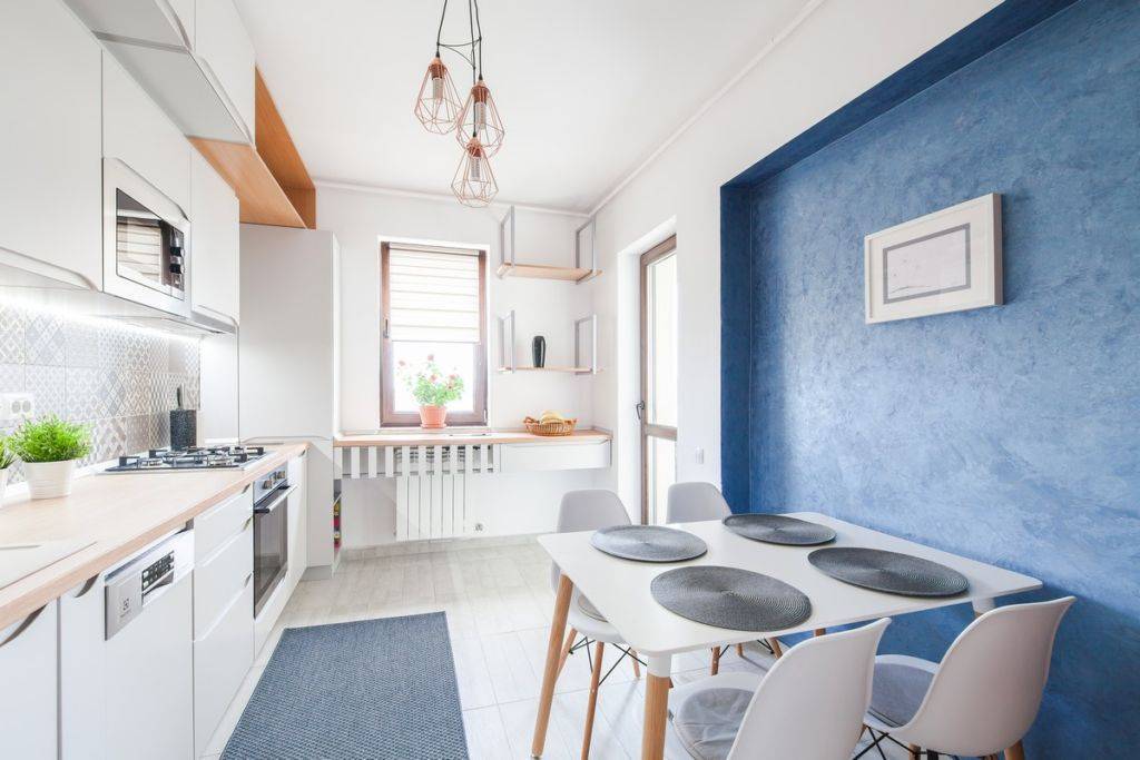 Стены в голубой кухне: выбор цвета, материала