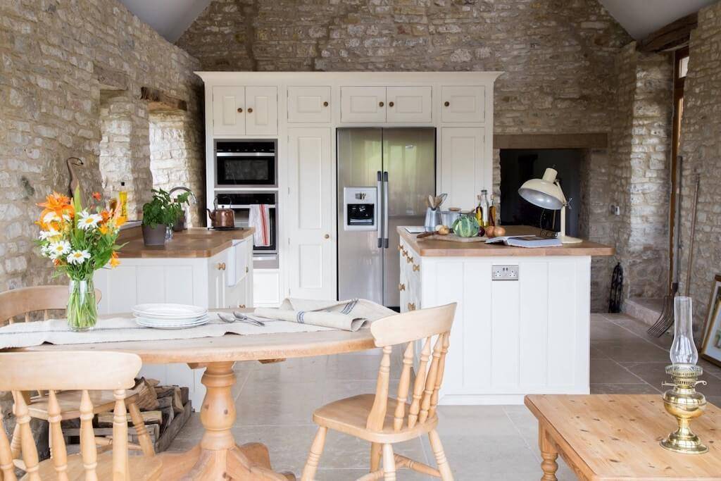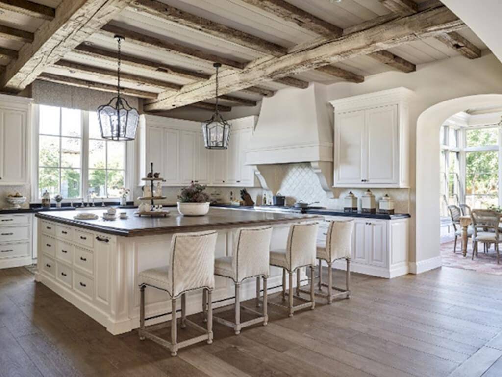 Гарнитуры белые или просто светлые, столешница и фартук чаще всего выполняются из плитки, а вот все остальное — из дерева. Это могут быть полы, обеденная группа и даже светильники.