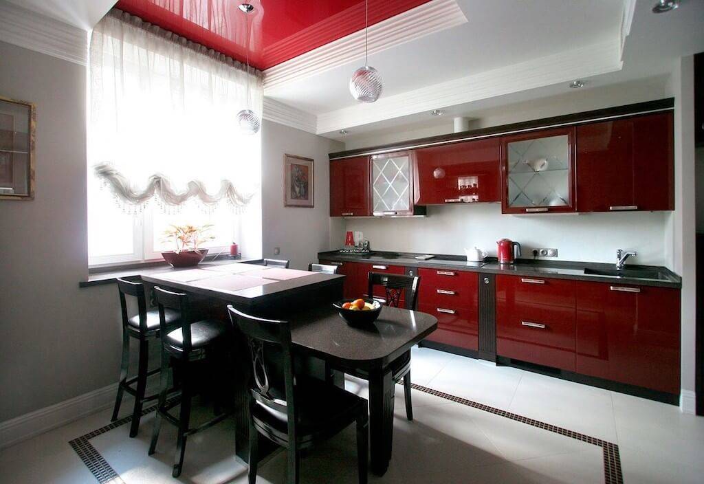 Потолки, как правило, делаются классическими, белыми, навесными. В случае если площадь комнаты позволяет сделать многоярусный потолок, то в его дизайн можно добавлять красный цвет.