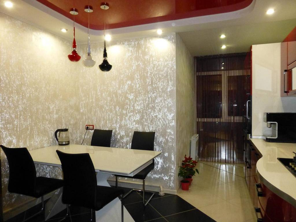 Для отделки кухни в красно-черной гамме дизайнеры советуют использовать обои нейтральных светлых оттенков с гладкой текстурой, однотонные и без орнамента. Они подчеркнут достоинства интерьера и выступят хорошим фоном для основных его тонов.