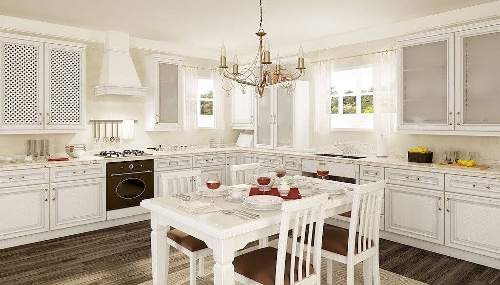 Это направления деревенского стиля, главной задачей которых является создание уютной атмосферы на кухне. Здесь тоже желательно использование мебели из натуральных материалов, причем лучше придать им возраста с помощью специального состаривания, например, патиной.