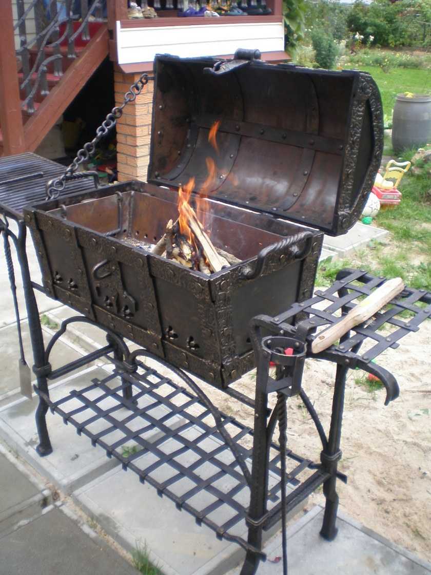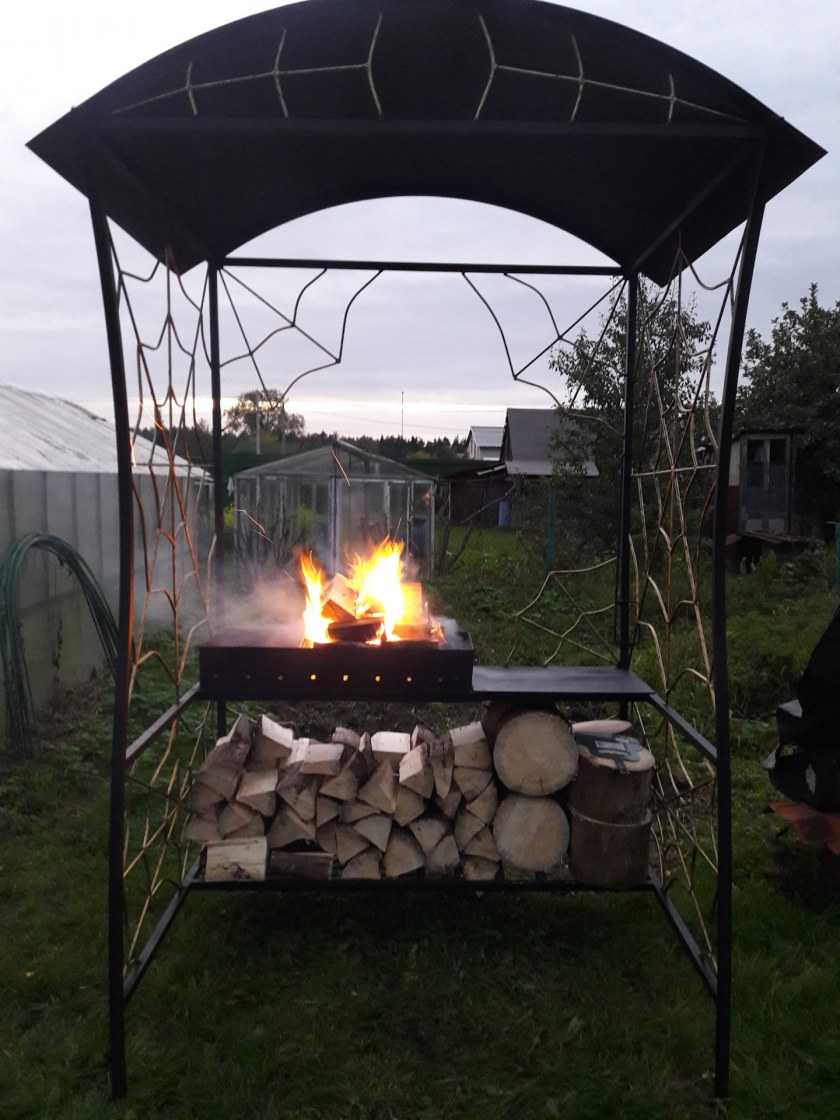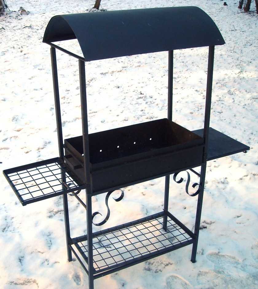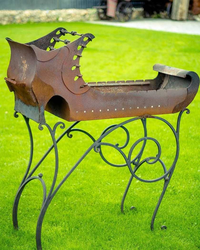 При сооружении металлических конструкций нюансов гораздо больше, могут использоваться разные элементы: листовая сталь, готовые элементы декора (обычно витые и кованые элементы) и части б/у изделий (столешницы, бочки, баки, этажерки), а также очаги бывают не только стационарными, но и передвижными в пределах участка.