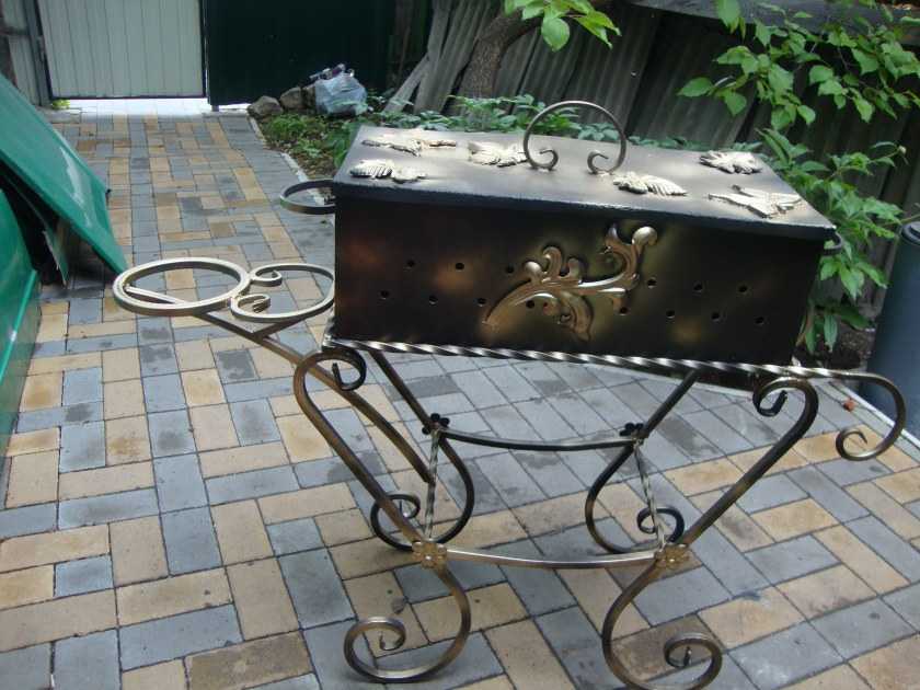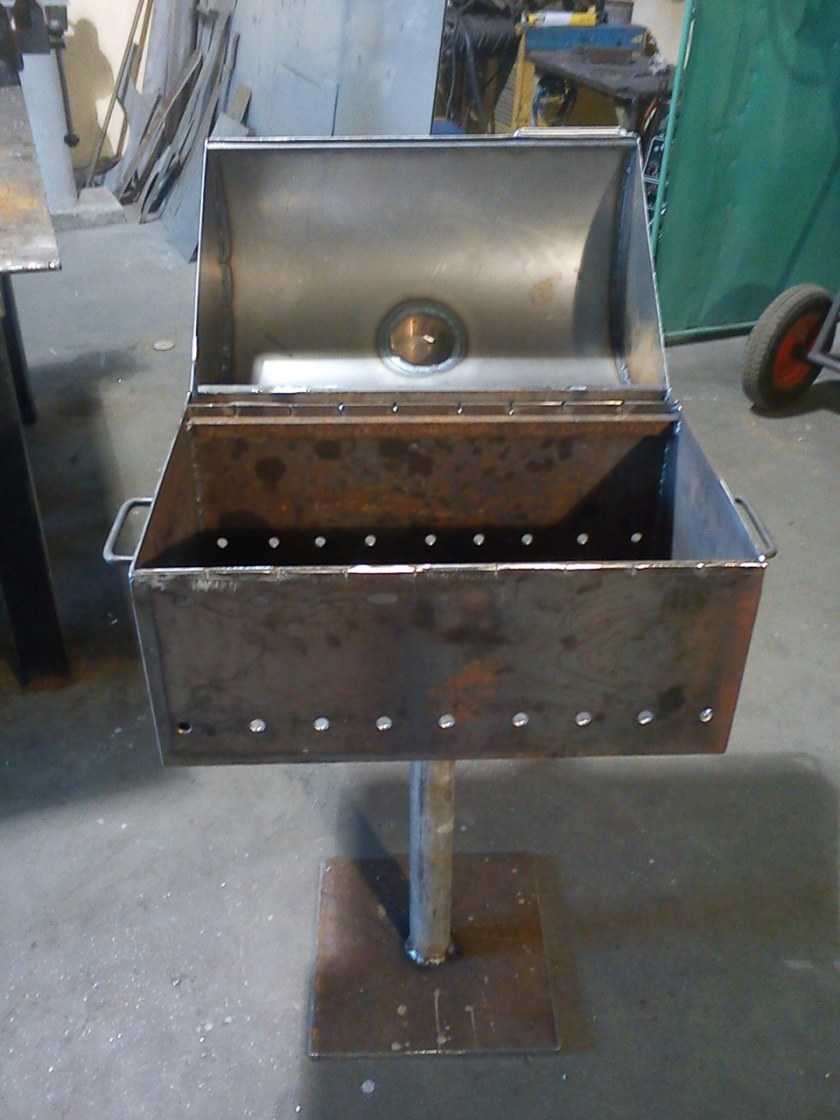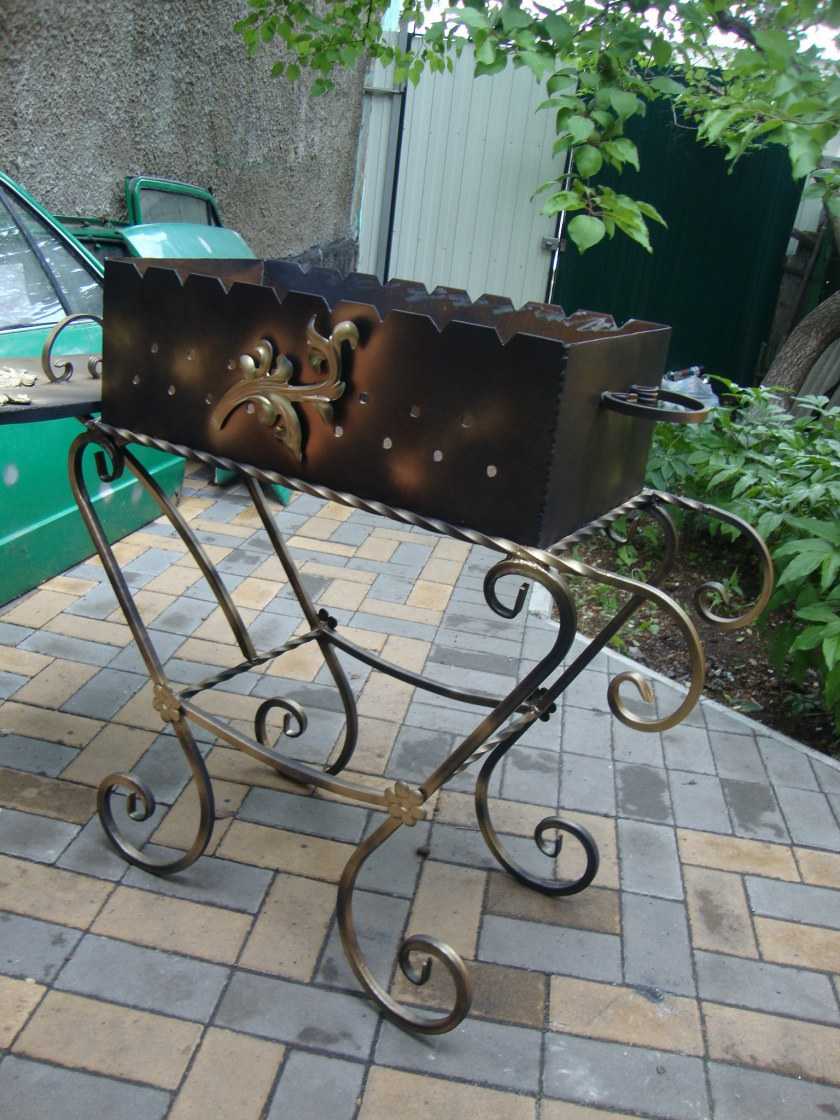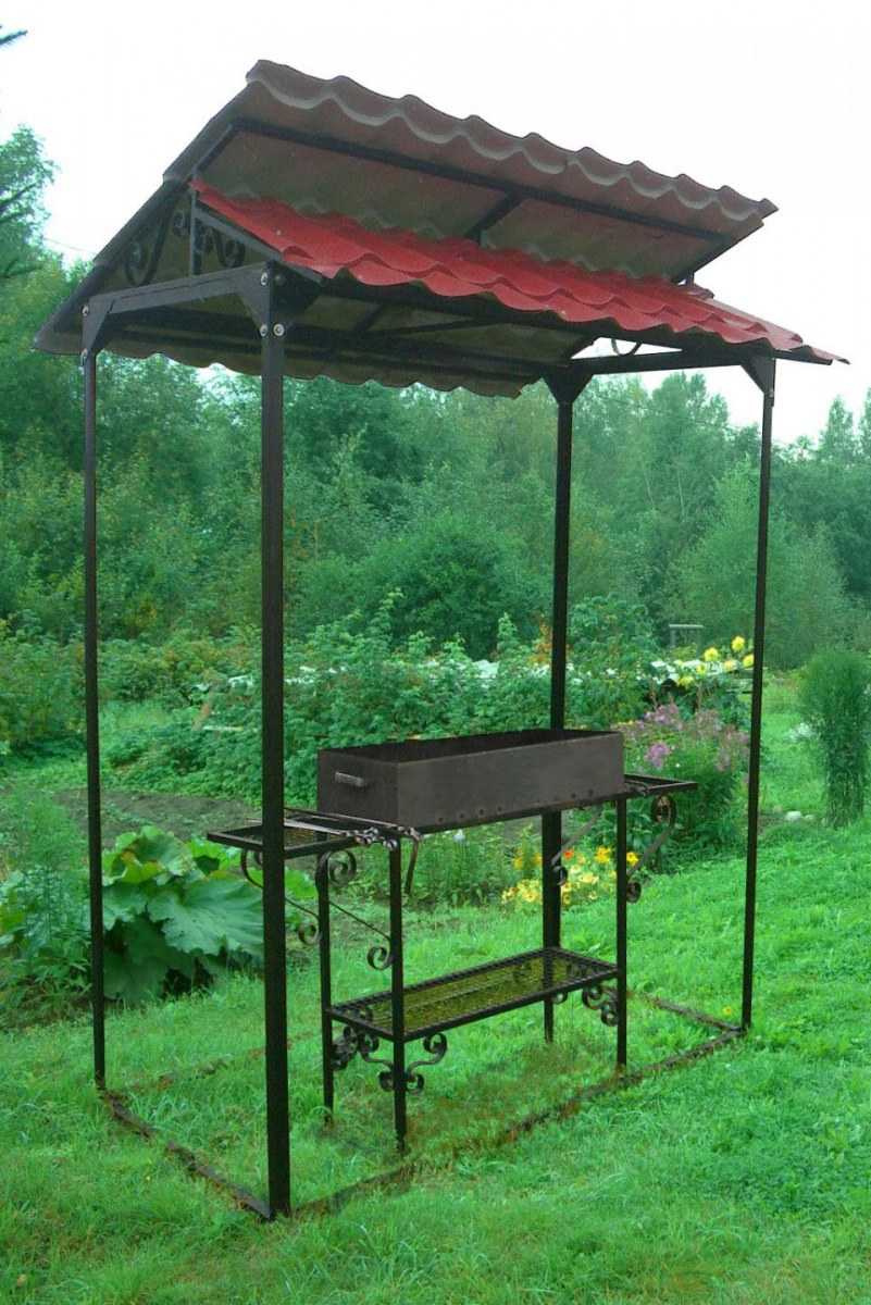 При сооружении металлических конструкций нюансов гораздо больше, могут использоваться разные элементы: листовая сталь, готовые элементы декора (обычно витые и кованые элементы) и части б/у изделий (столешницы, бочки, баки, этажерки), а также очаги бывают не только стационарными, но и передвижными в пределах участка.