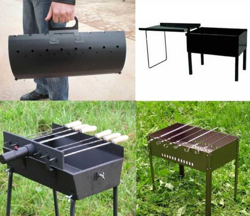 Чаще всего можно встретить мангал прямоугольной формы. Он может быть на высоких ножках или без них, складным или стационарным.